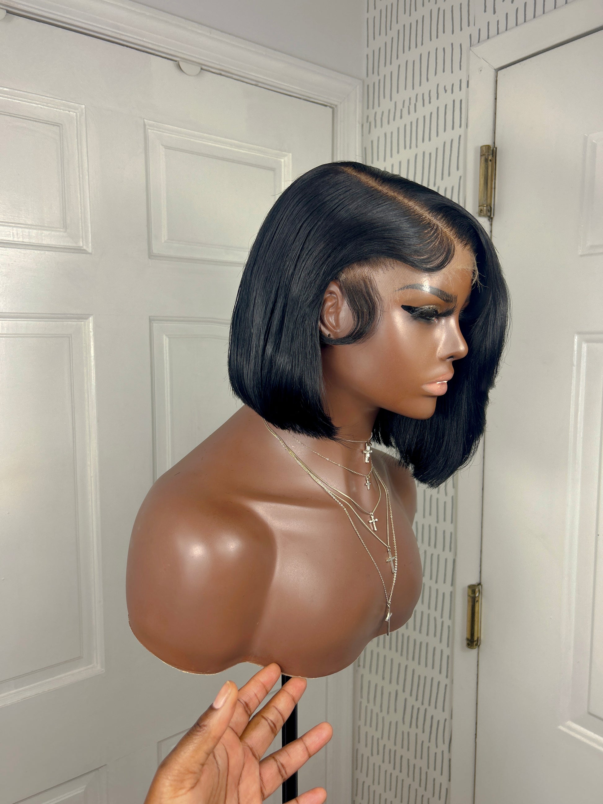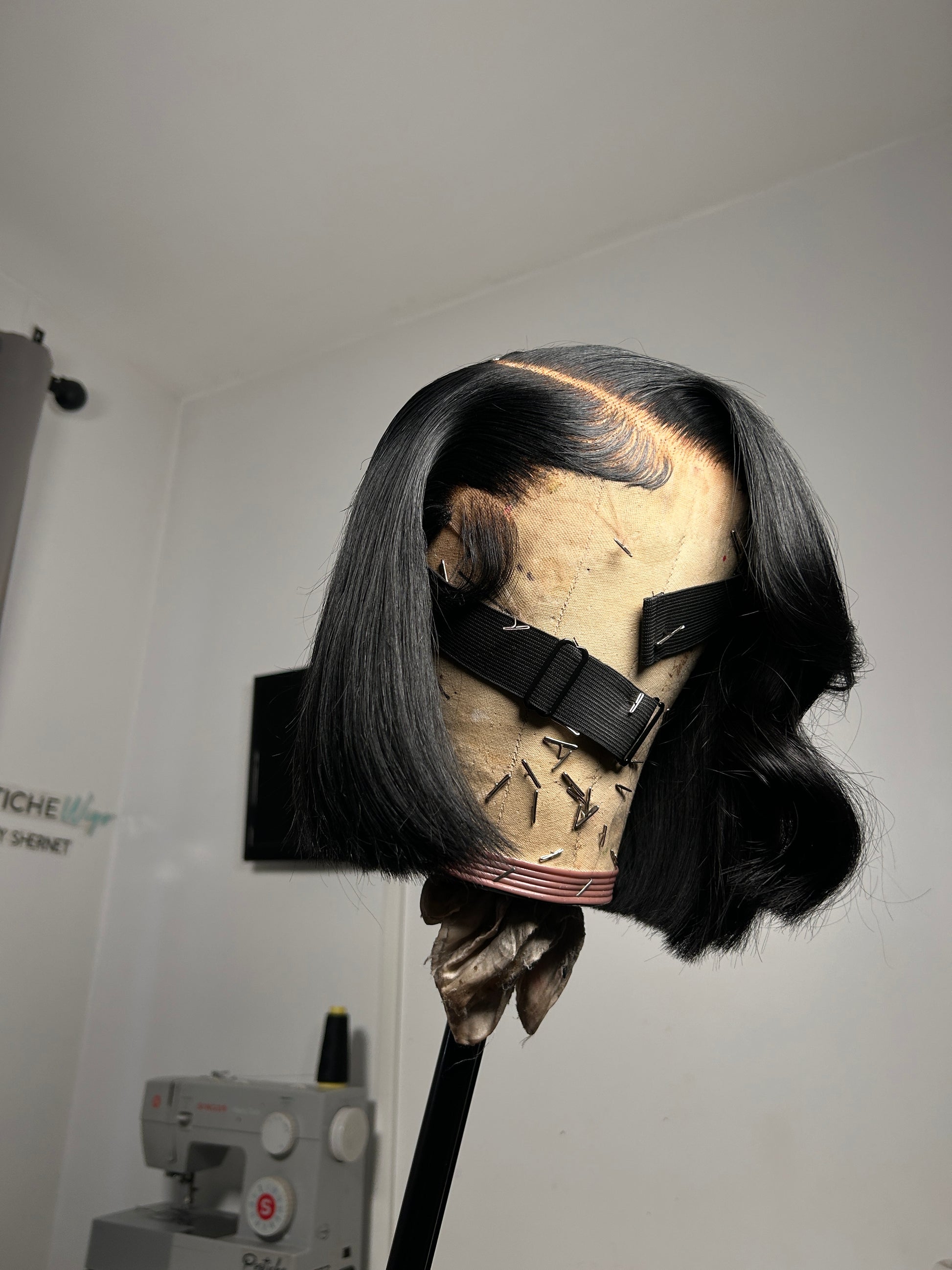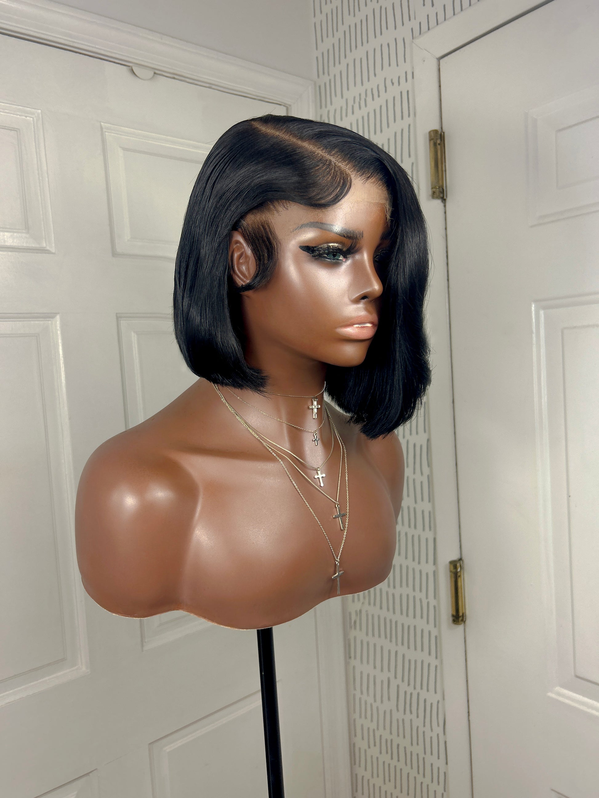 Toya is made from two 14-inch straight bundles paired with a 5x5 HD lace closure, showcasing a deep side faux frontal style including subtle bump and fringe details. This 100% human hair wig provides versatile styling options and can be worn using lace glue or glueless for enhanced comfort. It is constructed on a breathable ventilated dome cap, featuring one nape clip and an adjustable band for a secure fit.